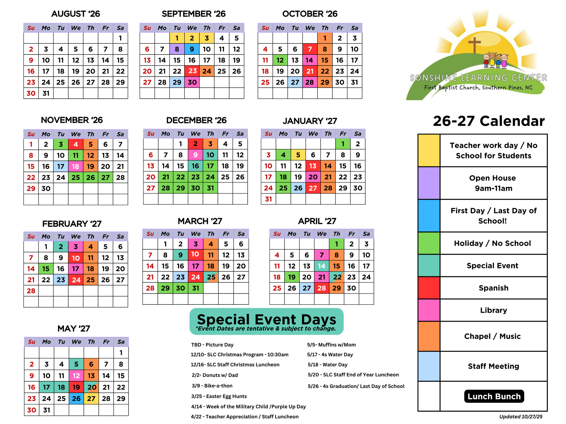 Sonshine Learning Center, a ministry of First Baptist Church Southern Pines, is committed to following the example of Jesus as we welcome children and their families to our preschool. Our staff, with the support and direction of Church leadership, provide each child with the spiritual, academic, physical, and emotional support needed for happy and healthy development. We believe that children are our most important resource and their early childhood experiences are crucial in the development of their future.